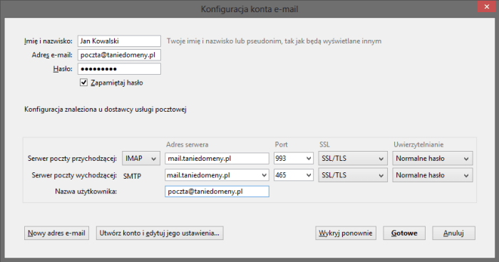 Klikamy Kontynuuj. Program Thunderbird następnie pobierze sugerowane wartości ustawień dla konta pocztowego. Prosimy o dokładne sprawdzenie wszystkich wartości oraz ewentualne poprawienie ich według poniższych wskazówek wybierając Konfiguracja zaawansowana.